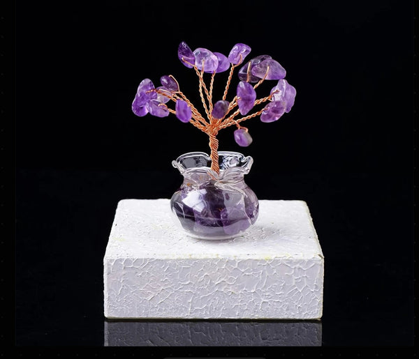 A symbol of growth, clarity, and positive energy. Each tree is hand-wired with copper branches, adorned with real tumbled gemstones, and set in a delicate glass vase.